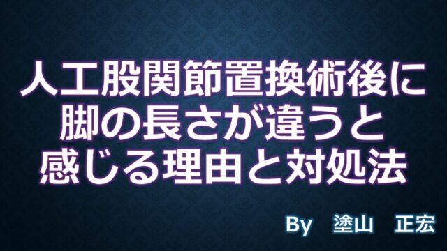 股関節 股関節374 人工股関節置換術後に脚の長さが違うと感じる理由と対処法 股関節の痛みが出る病気(変形性股関節症、寛骨臼形成不全、特発性大腿骨頭壊死症)の治療(保存療法)、および手術(人工股関節置換術、最小侵襲手術、MIS、前方アプローチ)について整形外科専門医(人工関節手術を専門)の塗山正宏が色々と説明します。 2026.04.20 股関節