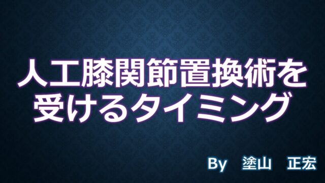 膝関節 膝関節230 人工膝関節置換術を受けるタイミング 膝関節の痛みが出る病気(変形性膝関節症、特発性膝骨壊死)の治療(運動療法、薬物療法、再生医療などの保存療法)、および手術(人工膝関節置換術、最小侵襲手術、MIS)について整形外科専門医(人工関節手術を専門)の塗山正宏が色々と説明します。 2026.03.19 膝関節